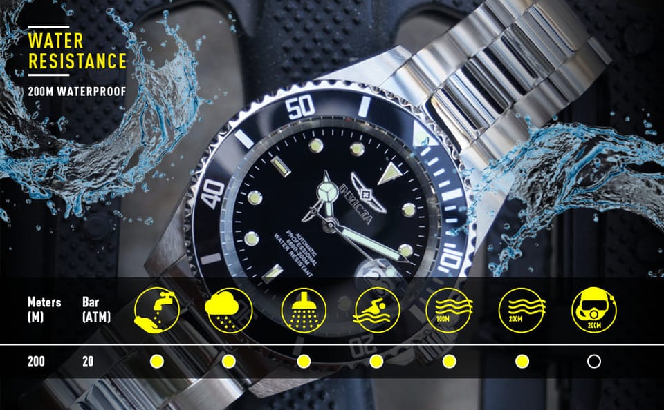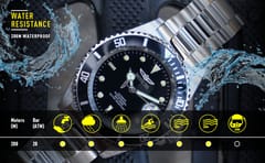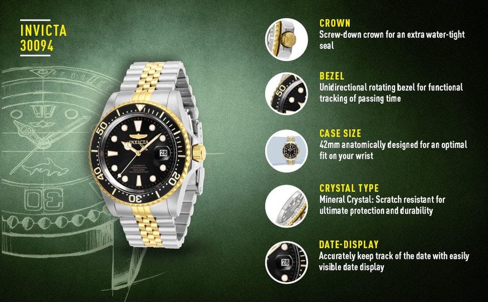 Zegarek męski Invicta Pro Diver Professional Automatic 30094 to idealny zegarek o eleganckim i stylowym charakterze i świetnymi parametrami technicznymi. Jest to zegarek do nurkowania wykonany z wysokiej jakości stali szlachetnej, pokrytej złotą powłoką. Urządzenie napędzane jest japońskim, automatycznym mechanizmem Seiko NH35A, z rezerwą chodu 41h. Szkło mineralne chroni przed drobnymi zarysowaniami i obtłuczeniami zegarka. Indeks oraz wskazówki posiadają powłokę luminescencyjną Trinite zakręcana koronka dodatkowo chroni przed wodą Wodoszczelność zegarka to 200 metrów, dzięki czemu nie trzeba go zdejmować do pływania ani nurkowania na większe głębokości.