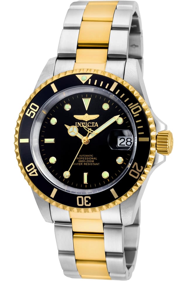 Ten model zachwyca elegancką kolorystyką, w której dominuje połączenie złota i srebra. Bransoleta z dwukolorowej stali nierdzewnej to harmonijne zestawienie stali z wyraźnymi złotymi akcentami, które biegną przez środek, dodając zegarkowi luksusowego charakteru. Czarna tarcza idealnie kontrastuje z jasnymi, złotymi indeksami i wskazówkami, zapewniając doskonałą czytelność oraz przyciągając uwagę. Klasyczny design zegarka podkreśla także złota luneta z precyzyjnymi oznaczeniami minutowymi, co dodaje całości elegancji i sportowego charakteru. Prestiż podkreślają subtelnie umieszczone logo Invicta na tarczy, zapięciu bransolety oraz boku koperty, które świadczy o doskonałej jakości wykonania i ekskluzywnym charakterze tego zegarka.