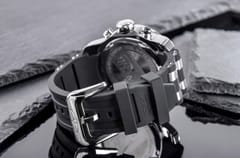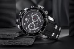 Koperta w srebrno-czarnym wykończeniu to pierwsza rzecz, która przyciąga uwagę. Srebrny metal kontrastuje z czarnymi akcentami, tworząc dynamiczne, męskie połączenie, które oddaje sportowy charakter tego modelu. Czarny bezel wprowadza surową, nowoczesną nutę, idealnie komponując się z resztą projektu. Czarna tarcza podkreśla mocny, minimalistyczny styl, dając zegarkowi wyrazistość i funkcjonalność. Srebrne indeksy i wskazówki wyróżniają się na tle głębokiej czerni, a dzięki fluorescencyjnym akcentom są doskonale widoczne nawet w słabym oświetleniu. Srebrny sekundnik płynnie przemieszcza się po tarczy, podkreślając precyzję działania tego modelu. Matowy, czarny kolor paska świetnie współgra z resztą zegarka, tworząc spójny, nowoczesny wygląd.