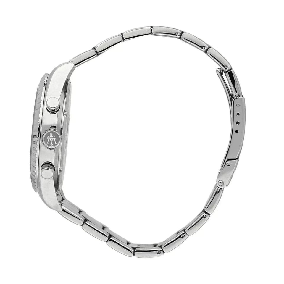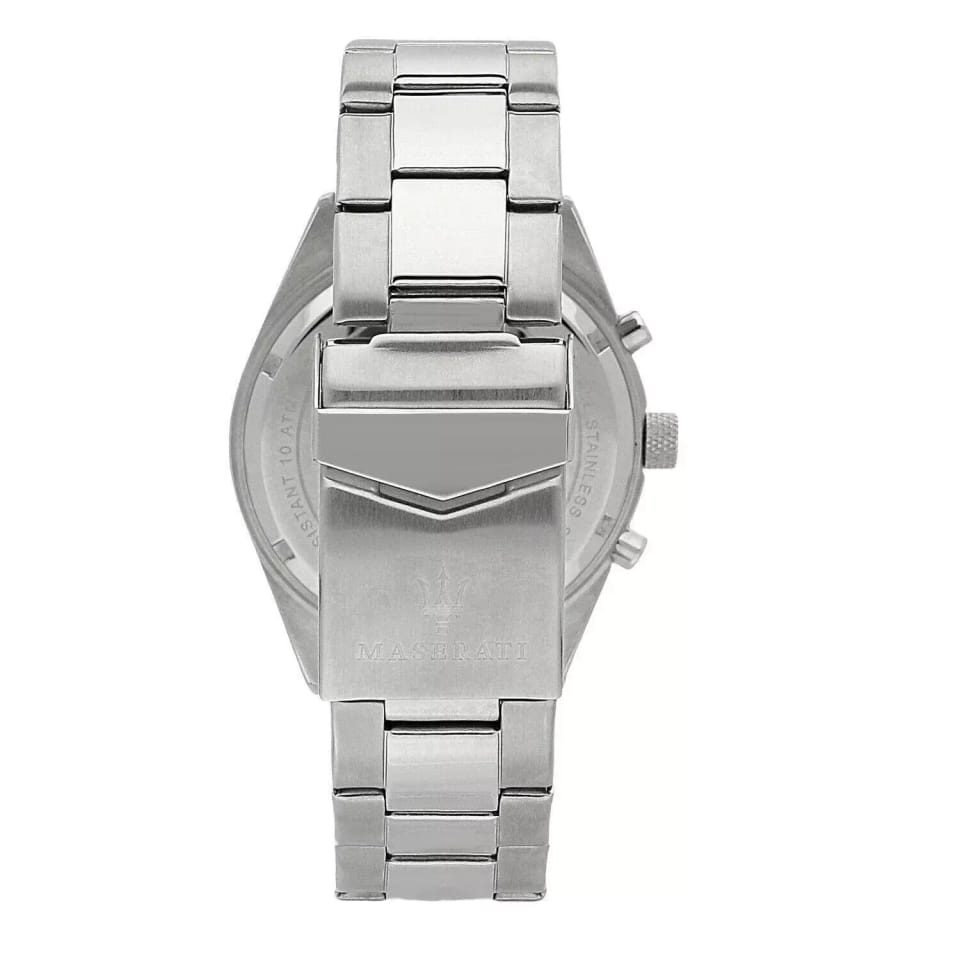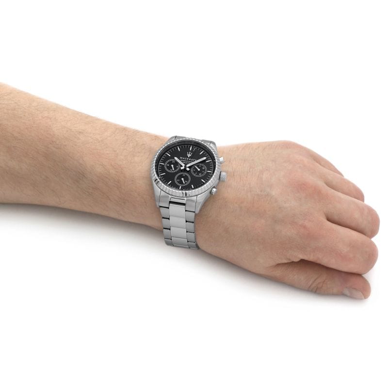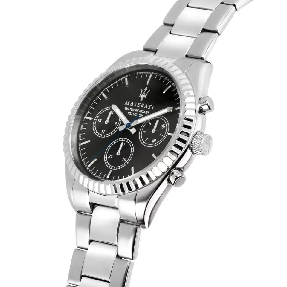 Zegarek Maserati Competizione R8853100023 to elegancki zegarek dla fanów motoryzacji i nie tylko. Na czarnej tarczy zabezpieczonej mineralnym szkłem znajdziemy subtarcze będące wskazaniami dnia tygodnia, dnia miesiąca i czasu dobowego.