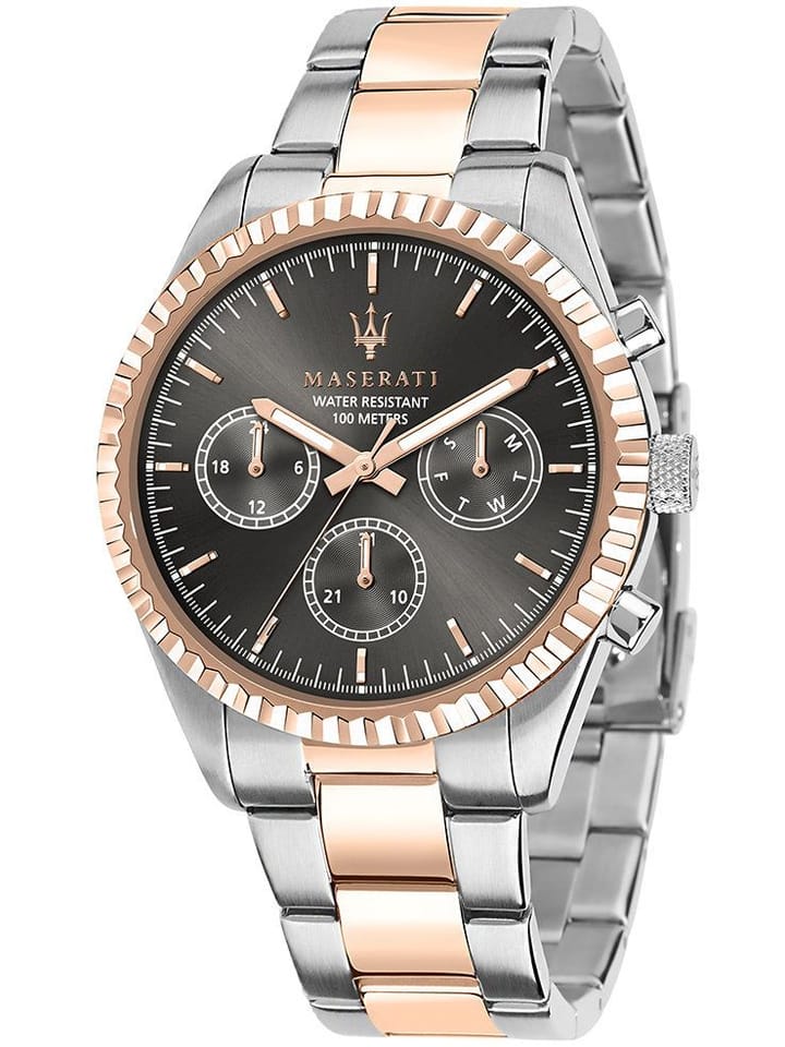 Zegarek Maserati COMPETIZIONE R8853100020 to klasyczny model, który przypadnie do gustu każdemu mężczyźnie. Po zegarki tej marki chętnie sięgają fani włoskiej, luksusowej marki Maserati, jak i osoby poszukujące czasomierza do noszenia na co dzień. Zegarek ten został wykonany w całości ze stali szlachetnej w kolorze srebra i różowego złota, która jest odporna na korozję. Na czarnej tarczy zabezpieczonej mineralnym szkłem znajdziemy subtarcze będące wskazaniami dnia tygodnia, dnia miesiąca i czasu dobowego. Za niezawodne działanie urządzenia odpowiada dokładny mechanizm kwarcowy zasilany baterią. Zegarek Maserati COMPETIZIONE R8853100020 posiada klasę wodoszczelności 10 ATM, co oznacza, że jest odporny na kontakt z wodą, można w nim bezpiecznie pływać.