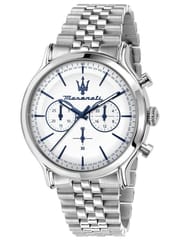 Zegarek Maserati R8873618034 EPOCA posiada mechanizm kwarcowy zasilany baterią. Kopertę w kolorze srebrnym wykonano z hipoalergicznej stali szlachetnej. Na białej tarczy czas precyzyjnie odmierzają granatowe wskazówki pokryte warstwą fluorescencyjną. Dodatkowy atut tego modelu to chronograf oraz wodoszczelność na poziomie 10 ATM co pozwala nam na swobodne pływanie. Model R8873618024 to połączenie niewymuszonej elegancji ze sportowym charakterem - musi przyciągać uwagę!