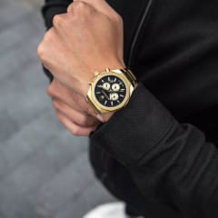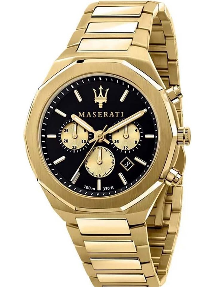 Męski zegarek MASERATI R8873642001 to klasyczny model o bardzo ponadczasowym wyglądzie, który przypadnie do gustu każdemu mężczyźnie. Po zegarki tej marki chętnie sięgają fani włoskiej, luksusowej marki Maserati, jak i osoby poszukujące czasomierza do noszenia na co dzień. Zegarek ten został wykonany w całości ze stali szlachetnej w kolorze złotym, która jest odporna na korozję. Czarna tarcza z datownikiem i chronografem przykryta jest szkiełkiem mineralnym. Za niezawodne działanie urządzenia odpowiada dokładny mechanizm kwarcowy zasilany baterią. Zegarek MASERATI R8873642001 posiada klasę wodoszczelności 10 ATM, co oznacza, że jest odporny na kontakt z wodą.