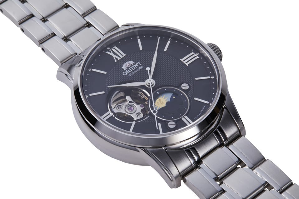 Czasomierz Orient Contemporary Sun & Moon RA-AS0008B10B to elegancki funkcjonalny męski zegarek do codziennego użytku jak i na wyjątkowe okazji. Czytelną, czarną tarczę przykryto sferycznym szkiełkiem mineralnym, dobrze chroniącym zarówno przed ewentualnymi zarysowaniami. Czasomierz działa w oparciu o niesłychanie dokładny japoński mechanizm z automatycznym naciągiem. Model Orient Contemporary Sun & Moon RA-AS0008B10B wyposażono dodatkowo w funkcje outdoor, czyli wskaźnik , który pokazuje aktualnie podświetlaną przez Słońce część Księżyca
