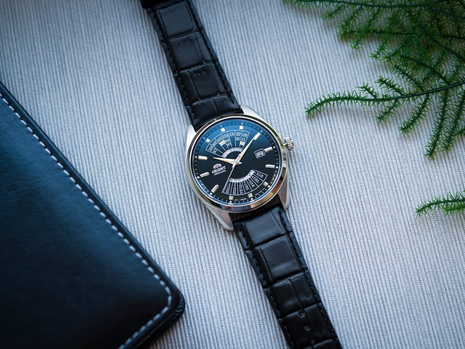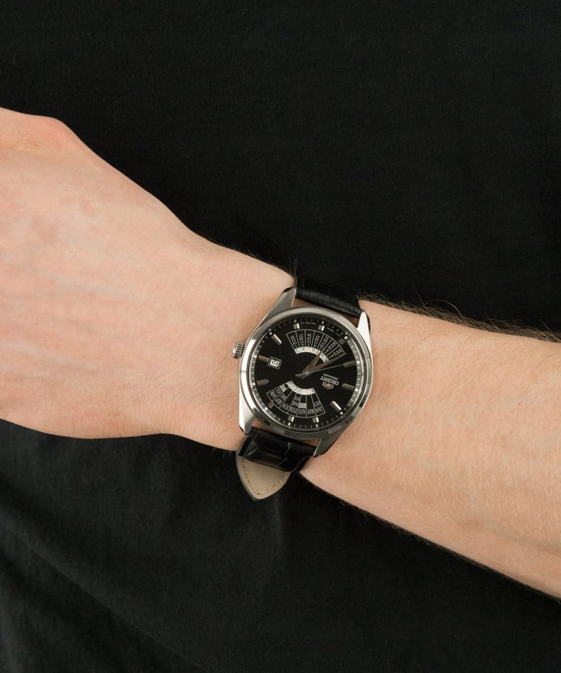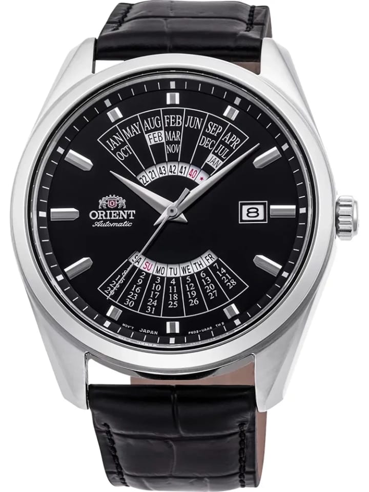 Zegarek Orient Automatic RA-BA0006B10B z serii Multi Year Calendar to klasyczny elegancki zegarek. Czasomierz działa w oparciu o niesłychanie dokładny japoński mechanizm z automatycznym naciągiem. Na czarnej tarczy chronionej mineralnym szkłem umieszczono charakterystyczny dla marki kalendarz oraz datowniki dni miesiąca i tygodnia.