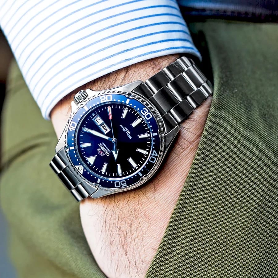 Zegarek Orient Kamasu RA-AA0002L19B to klasyczny elegancki zegarek. Czasomierz działa w oparciu o niesłychanie dokładny japoński mechanizm z automatycznym naciągiem. Na niebieskiej tarczy chronionej mineralnym szkłem umieszczono datowniki