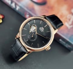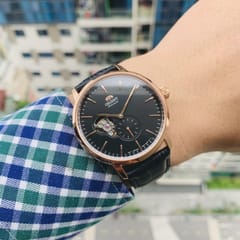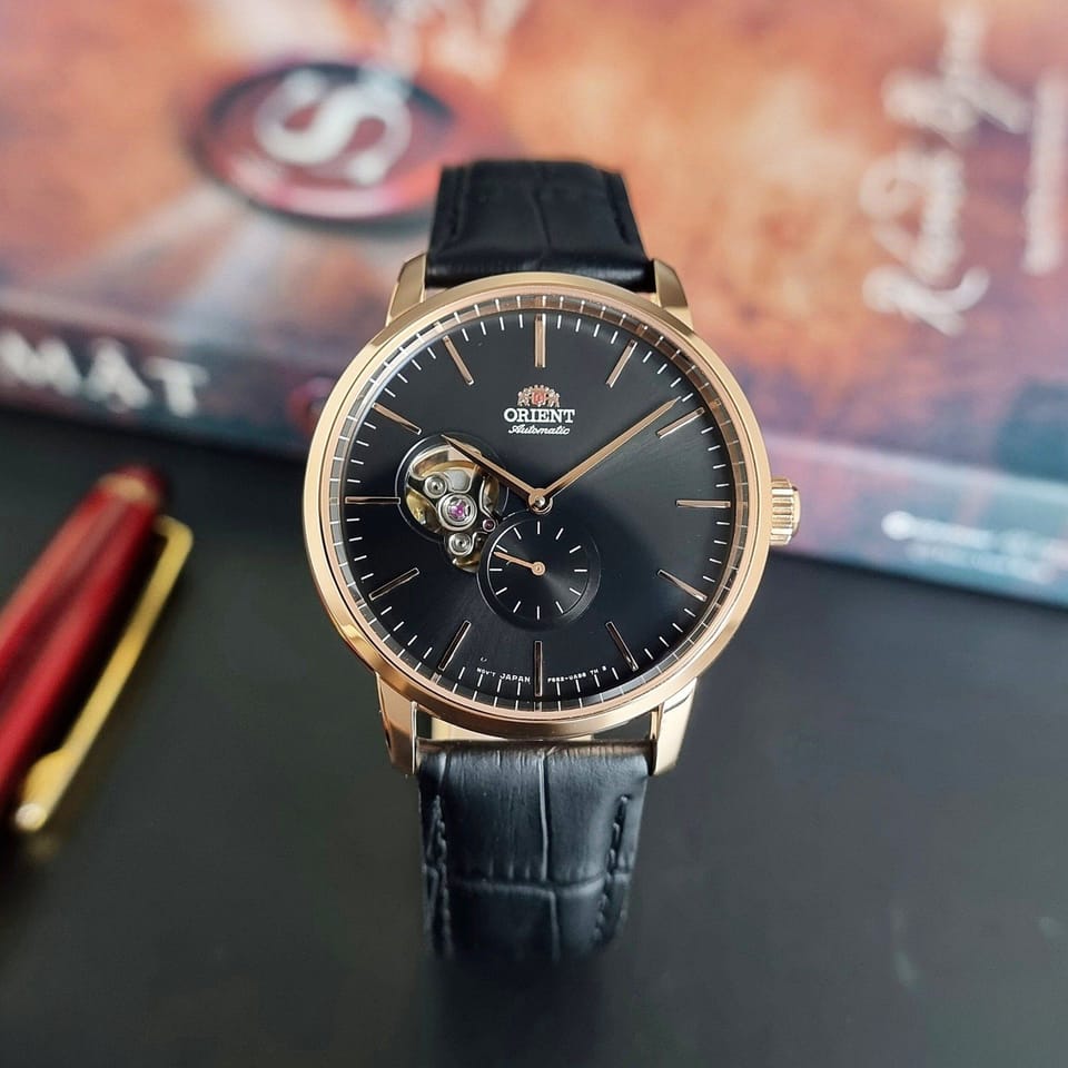 Model Orient Open Heart Automatic RA-AR0103B10B posiada czarny skórzany pasek oraz różowo złotą kopertę, wykonaną z wysokiej jakości stali nierdzewnej. Klasa wodoszczelności czasomierza to WR50, co gwarantuje szczelność zegarka w przypadku drobnych zachlapań.
