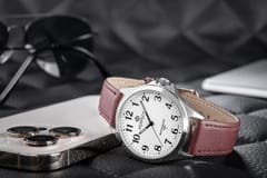 Koperta: srebrna Tarcza: biała Indeksy: czarne Wskazówki: czarne, fluorescencja Sekundnik: czarny Pasek: brązowy, nitka: brązowa