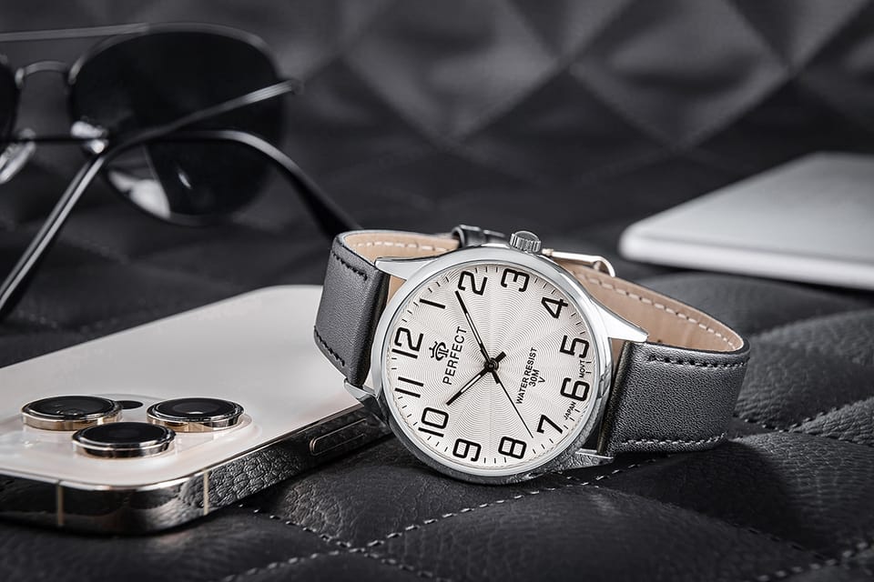 Skórzany pasek tego zegarka to kwintesencja klasy i wygody. Wykonany z najwyższej jakości materiału, komfortowo dopasowuje się do nadgarstka, oferując nie tylko trwałość, ale też elegancki wygląd. Jego miękkość zapewnia komfort noszenia na co dzień, a perfekcyjne wykończenie podkreśla charakterystyczny styl marki Perfect.