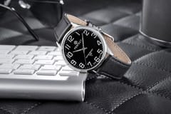 Ten zegarek to doskonałe połączenie elegancji i nowoczesności, które przyciąga wzrok od pierwszego wejrzenia. Srebrna koperta w elegancki sposób otacza czarną tarczę, tworząc zjawiskowy kontrast, który emanuje pewnością siebie i stylem. Białe indeksy zapewniają doskonałą czytelność, a srebrne wskazówki dodają mu wyrafinowania, sprawiając, że czas staje się nie tylko praktycznym aspektem, ale także elegancką dekoracją nadgarstka.