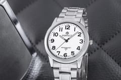 Ten zegarek to kwintesencja męskiego stylu. Srebrna koperta otacza elegancką, białą tarczę, której czarne indeksy oraz fluorescencyjne wskazówki zapewniają nie tylko klasyczny wygląd, ale i doskonałą czytelność w każdych warunkach. Czarne akcenty wprowadzają do projektu dynamikę i charakter, podczas gdy srebrna bransoleta dodaje całości wyrafinowania. To idealny wybór dla mężczyzny, który ceni sobie prostotę połączoną z elegancją. Z tym zegarkiem czas staje się synonimem stylu i pewności siebie.