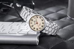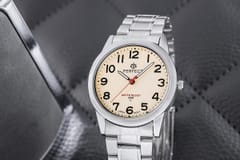 Ten zegarek to doskonałe połączenie elegancji i nowoczesności, które przyciąga spojrzenia. Srebrna koperta pięknie kontrastuje z beżową, metaliczną tarczą, tworząc subtelny, ale wyrazisty efekt. Czarne indeksy zapewniają klarowność, a fluorescencyjne wskazówki gwarantują, że czas zawsze jest czytelny, nawet w ciemności.