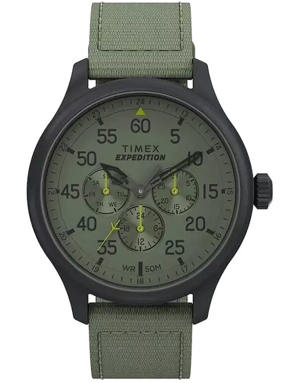 Zegarek męski Timex Expedition Field TW4B31000 to wyjątkowy czasomierz, który doskonale łączy klasyczny design z nowoczesnymi rozwiązaniami. Posiada zielony pasek oraz czarną kopertę, co nadaje mu wyjątkowego charakteru. Zielona tarcza zegarka wyróżnia się indeksami w kolorze żółtym i czarnym, które zapewniają doskonałą czytelność godziny. Model został wyposażony w datownik, który wskazuje dzień tygodnia, co zwiększa funkcjonalność czasomierza oraz chronograf. Zegarek posiada wodoodpornoś na poziomie WR50, zegarek jest odporny na zanurzanie w wodzie do 50m, co czyni go praktycznym wyborem na co dzień. To idealny wybór dla mężczyzn, którzy szukają eleganckiego, a zarazem funkcjonalnego zegarka.