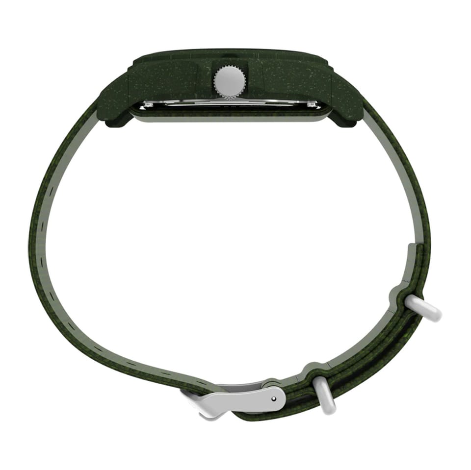 Model z linii Timex Reclaim Ocean wyróżnia się surową, przyrodniczą estetyką. Koperta w odcieniu oliwkowej zieleni została wykonana z materiałów z recyklingu, co nadaje jej lekko matowe wykończenie i podkreśla ekologiczny charakter zegarka. Utrzymany w zbliżonej tonacji, wytrzymały pasek tekstylny dodaje całości outdoorowego stylu. Na ciemnej tarczy umieszczono duże, czytelne cyfry, dzięki którym wskazania czasu są dobrze widoczne niezależnie od otoczenia. To idealny wybór dla osób preferujących minimalistyczne wzornictwo połączone ze świadomym podejściem do środowiska. Zegarek posiada kopertę wykonaną z materiału tide ocean, czyli tworzywa powstałego z przetworzonego plastiku morskiego, co zmniejsza jego wpływ na środowisko. Uzupełnia go miękki, tkaninowy pasek z recyklingu, gwarantujący wygodne dopasowanie. Model wyposażono w podświetlenie INDIGLO, szkiełko mineralne oraz datownik na godzinie 3, dzięki czemu jest praktyczny na co dzień. Wodoodporność 30M chroni go przed zachlapaniem, a czytelna tarcza z arabskimi cyframi pozwala szybko odczytać godzinę. Całość napędza precyzyjny mechanizm kwarcowy.
