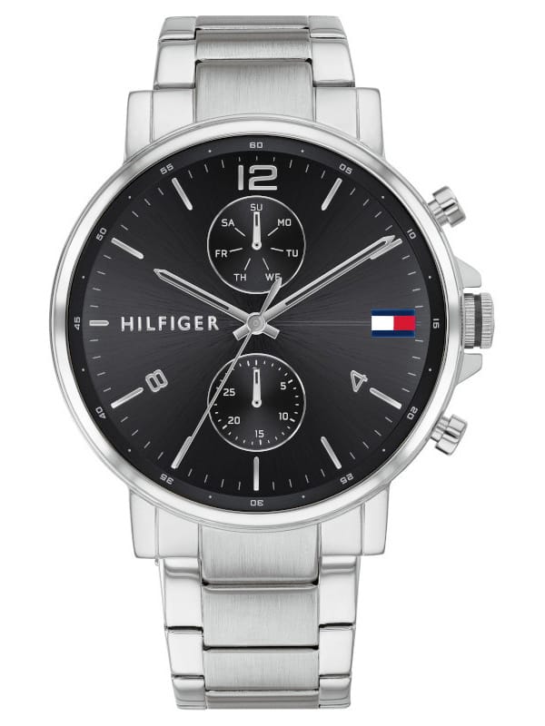 Zegarek męski Tommy Hilfiger Daniel 1710413 to model kwarcowy zasilany baterią, który charakteryzuje się eleganckim designem. Posiada okrągłą kopertę ze stali szlachetnej w srebrnym kolorze, w której znajduje się czarna tarcza z sub-tarczami datowników dni tygodnia oraz miesiąca. Indeksy i wskazówki na tarczy zapewniają łatwość odczytu. Zegarek jest doskonałym wyborem do codziennego użytku, a jego srebrna stalowa bransoleta z pewnością przyciągnie wzrok. Wodoszczelność na poziomie 50 m oznacza, że zegarek jest odporny na większe zachlapania, takie jak podczas mycia rąk czy korzystania z prysznica.