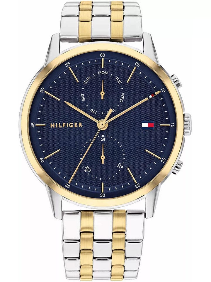 Zegarek męski TOMMY HILFIGER 1710432 Easton to nowoczesny i elegancki model do noszenia na co dzień, jak i na specjalne okazje. Koperta oraz bransoleta wykonana wysokiej klasy stali szlachetnej 316L, odpornej na korozję oraz hipoalergicznej w połączeniu kolorystycznym złota i srebra. Na eleganckiej granatowej tarczy, znajdują się subtarcze wskazujące: dzień miesiąca oraz dzień tygodnia. Całość chroniona szkłem mineralnym. Za odmierzanie czasu w zegarku Tommy Hilfiger 1710432 Easton odpowiada mechanizm kwarcowy. Model 1710432 Easton posiada wodoszczelność na poziomie 5ATM co czyni go w niewielkim stopniu odpornym za wodę. Całość dopracowano w najdrobniejszym szczególe oraz zaprojektowano w zgodzie z aktualnymi trendami w modzie, otrzymując klasyczny, ale jakże elegancki zegarek.