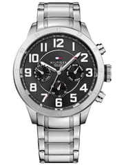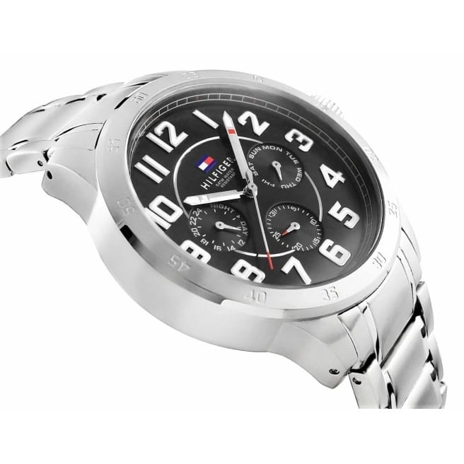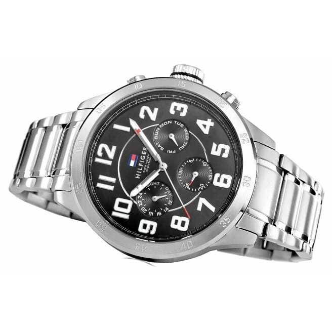 Zegarek męski Tommy Hilfiger 1791054 TREND to stylowy męski zegarek, idealny zarówno do eleganckiego ubioru, jak i do noszenia na co dzień. Bransoletka oraz koperta wykonane zostały ze stali szlachetnej w kolorze srebrnym. Na tarczy zabezpieczonej mineralnym szkłem znajdziemy datownik wskazujący dzień miesiąca oraz subtarcze będące wskazaniami dni tygodnia, aktualnej daty oraz 24h czasu dobowego. Klasa wodoszczelności czasomierza TH 1791054 to WR50, co gwarantuje szczelność zegarka w przypadku drobnych zachlapań.