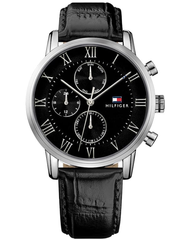 Zegarek męski Tommy Hilfiger Kane 1791401 to połączenie klasyki z nowoczesnym designem, idealny do eleganckich stylizacji, jak i na co dzień. Został wyposażony w czarny skórzany pasek oraz kopertę wykonaną z wysokiej jakości stali nierdzewnej. Tarcza w odcieniu czerni jest czytelna, a mineralne szkło skutecznie chroni ją przed zarysowaniami i uszkodzeniami. Czasomierz działa na precyzyjnym mechanizmie kwarcowym zasilanym baterią. Model ten posiada funkcje datownika dni tygodnia oraz miesiąca, umieszczone przy godzinach 6 i 12, oraz wskazanie czasu w formacie 24-godzinnym. Dzięki wodoodporności na poziomie 30 metrów, zegarek jest odporny na drobne zachlapania.