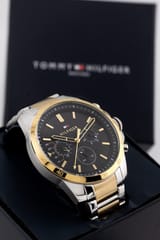 Zegarek Tommy Hilfiger Decker 1791559 to elegancka propozycja, która doskonale uzupełni męski, formalny look. Bransoleta i koperta, wykonane z wysokiej jakości stali szlachetnej, zapewniają nie tylko trwałość, ale i komfort noszenia, nie powodując reakcji alergicznych. Połączenie srebrno-złotych akcentów sprawia, że zegarek idealnie pasuje do garnituru, stając się wyjątkowym dodatkiem na specjalne okazje.