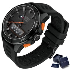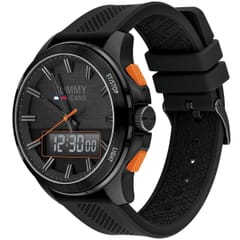 Zegarek męski TOMMY HILFIGER 1791763 - analogowo-cyfrowy model zegarka będzie doskonałym wyborem do codziennych oraz sportowych stylizacji. Nowoczesny design daje szerokie pole manewru z kolorystyką i charakterem strojów, do których zostanie dobrany. Ten model posiada stylową kopertę w czarnym kolorze, do której dopasowany został czarny pasek. Tarcza w kolorze czarnym wykonana wysokiej klasy stali szlachetnej, odpornej na korozję.Za odmierzanie czasu w zegarku Tommy Hilfiger 1791763 odpowiada mechanizm kwarcowy, do którego energia go zasilająca pochodzi z baterii. Model 1791763 posiada wodoszczelność na poziomie 3ATM co czyni go w niewielkim stopniu odpornym za wodę. Całość dopracowano w najdrobniejszym szczególe oraz zaprojektowano w zgodzie z aktualnymi trendami w modzie, otrzymując klasyczny oraz sportowy zegarek.