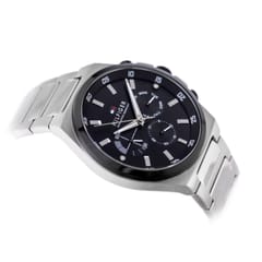 Zegarek w tej wersji łączy elegancję z nowoczesnym stylem, oferując doskonale wyważoną estetykę. Metaliczna koperta w połączeniu z czarną tarczą stanowi elegancką bazę, która zyskuje na dynamice dzięki srebrnym indeksom i wskazówkom. Czerwony akcent w logo przyciąga wzrok, dodając odrobiny świeżości i charakteru. Srebrna bransoleta doskonale dopełnia całość, tworząc spójną i stylową całość. To zegarek stworzony z myślą o mężczyznach, którzy cenią subtelną elegancję i szukają dodatku, który pasuje zarówno do codziennych stylizacji, jak i bardziej formalnych okazji.