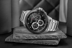 Czarny, mocny bezel z charakterystycznymi śrubkami dodaje mu surowego, industrialnego charakteru, który przyciąga wzrok i podkreśla Twój zdecydowany styl. Głęboka, matowa czerń tarczy emanuje tajemnicą i klasą, podczas gdy subtelne srebrne indeksy i wskazówki dodają blasku i wyrazistości. Srebrna koperta i bransoleta z polerowanym wykończeniem to symbol nowoczesności, który idealnie balansuje pomiędzy surowością a wyrafinowaniem. Zintegrowane subtarcze harmonijnie wtapiają się w kompozycję, oferując praktyczne funkcje bez zaburzania minimalistycznego designu. To czasomierz dla mężczyzn, którzy chcą wyrazić swój indywidualizm i pewność siebie, niezależnie od okazji.