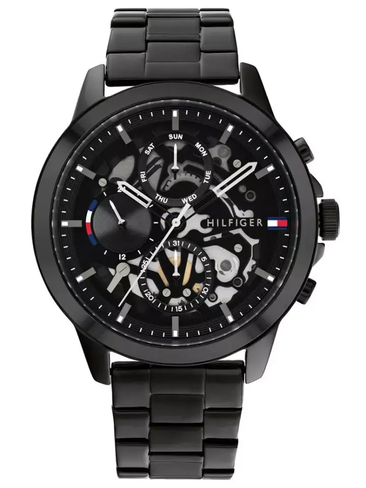 Zegarek męski TOMMY HILFIGER Henry 1710478 to nowoczesny i elegancki model do noszenia na co dzień. Koperta oraz bransoleta wykonana wysokiej klasy stali szlachetnej 316L, odpornej na korozję oraz hipoalergicznej. Na czarnej tarczy, ze szlifem słonecznym, subtarcze wskazujące: dzien miesiąca, dzień tygodnia oraz czas 24 godzinny. Całość chroniona szkłem mineralnym.Za odmierzanie czasu w zegarku Tommy Hilfiger 1710478 odpowiada mechanizm kwarcowy, do którego energia go zasilająca pochodzi z baterii. Model 1710478 posiada wodoszczelność na poziomie 5ATM co czyni go w niewielkim stopniu odpornym za wodę. Całość dopracowano w najdrobniejszym szczególe oraz zaprojektowano w zgodzie z aktualnymi trendami w modzie, otrzymując klasyczny, ale jakże elegancki zegarek.