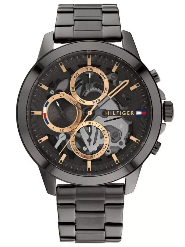 Zegarek męski TOMMY HILFIGER Henry 1710479 to nowoczesny i elegancki model do noszenia na co dzień. Koperta oraz bransoleta wykonana wysokiej klasy stali szlachetnej 316L, odpornej na korozję oraz hipoalergicznej. Na szarej tarczy, ze szlifem słonecznym, subtarcze wskazujące: dzien miesiąca, dzień tygodnia oraz czas 24 godzinny. Całość chroniona szkłem mineralnym.Za odmierzanie czasu w zegarku Tommy Hilfiger 1710479 odpowiada mechanizm kwarcowy, do którego energia go zasilająca pochodzi z baterii. Model 1710479 posiada wodoszczelność na poziomie 5ATM co czyni go w niewielkim stopniu odpornym za wodę. Całość dopracowano w najdrobniejszym szczególe oraz zaprojektowano w zgodzie z aktualnymi trendami w modzie, otrzymując klasyczny, ale jakże elegancki zegarek.