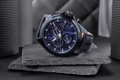Prawdziwy majstersztyk, który przyciąga spojrzenia unikalnym detalem tarczy "open heart" wzbogaconą efektownym szlifem słonecznym i giloszowaniem. Granatowy skórzany pasek podkreśla klasyczny styl, a subtarcze oferują funkcje takie jak datownik dni miesiąca, dni tygodnia oraz 24-godzinny format czasu. To zegarek, który mówi: "zawsze stawiaj na jakość" i doskonale odzwierciedla indywidualność mężczyzny, który go nosi.