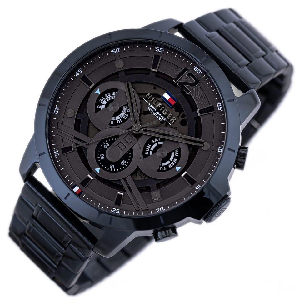 Zegarek męski Tommy Hilfiger LUCA 1710493 to modowy model w stylu casual, który pasuje do wielu stylizacji. Koperta oraz bransoleta w kolorze niebieskim wykonana z mocnej stali szlachetnej jest odporna na korozję, szkło mineralne na tarczy jest bardzo odporne na stłuczenia i zarysowania. Czarna tarcza została wyposażona w funkcjonalne subtarcze czasu 24h, datownika dni tygodnia oraz datownika dni miesiąca. Wodoszczelność zegarka jest na poziomie 5 ATM, można z nim się bezpiecznie kąpać.