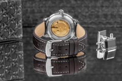 Przezroczysty dekiel, który odsłania precyzyjnie wykonany automatyczny mechanizm, to subtelny detal, który w pełni podkreśla prestiżowy charakter zegarka. Dzięki temu wyjątkowemu rozwiązaniu, możesz podziwiać mistrzowską pracę mechanizmu w każdej chwili, co nadaje zegarkowi jeszcze większego wyrafinowania. Takie rozwiązanie to ukłon w stronę tradycji zegarmistrzowskich, które opierają się na precyzji mechaniki i wysokiej jakości rzemiośle.