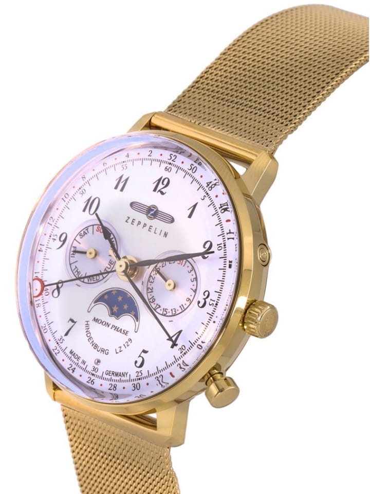 Zeppelin LZ129 Hindenburg to męski zegarek kwarcowy, który łączy klasyczną elegancję z nowoczesnym designem. Koperta ze stali nierdzewnej w złotym kolorze otacza srebrną tarczę, a całość uzupełnia złoty pasek wykonany ze stali chirurgicznej, tworząc wyjątkowo szykowną kompozycję.