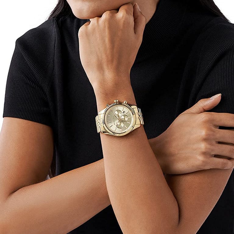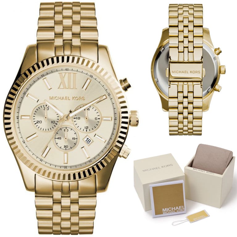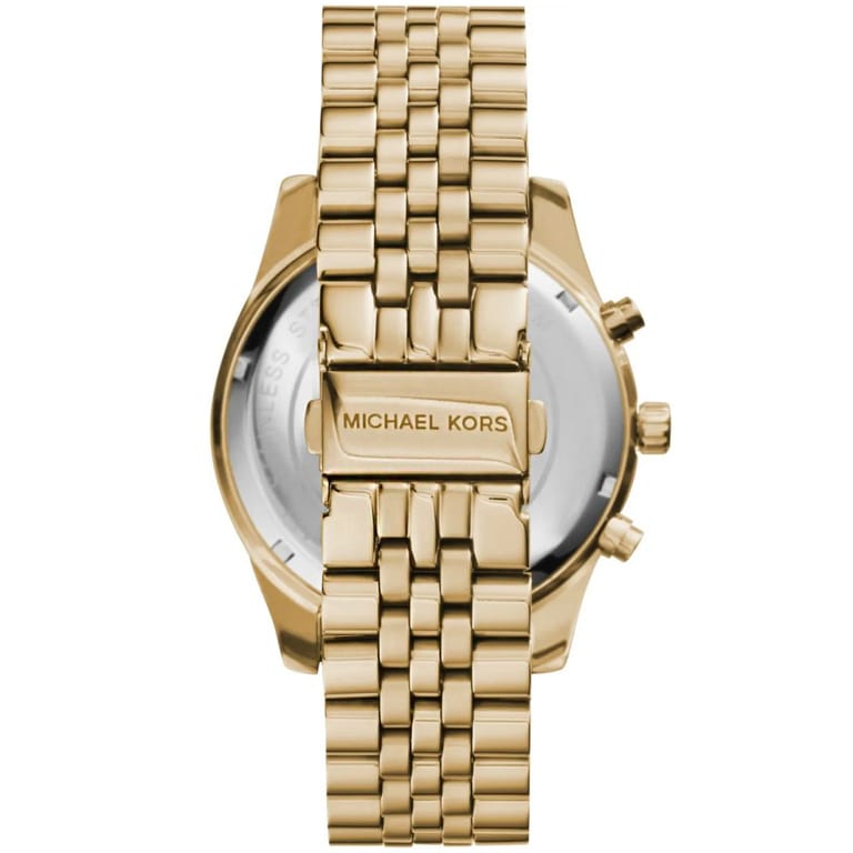 Model Michael Kors MK8281 z serii Lexington to elegancki zegarek na bransolecie w kolorze złotym wykonanej ze stali szlachetnej. Oznaczenia godzinowe w postaci cyfr rzymskich oraz indeksów świetnie komponują się z tarczą i wskazówkami. Wyposażony jest w precyzyjny mechanizm kwarcowy, dzięki któremu zegarek dokładanie pokazuje aktualną godzinę. Dostępne funkcje to chronograf, datownik dnia miesiąca oraz 24-godzinne wskazanie czasu. Tarczę ochrania mineralne, odporne na zarysowania szkiełko.