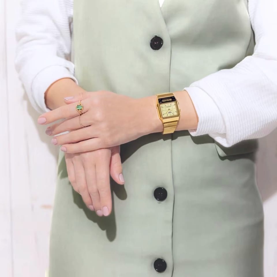 Zegarek Casio Vintage Dual Time AQ-800EG-9ADF to wyjątkowy model, który łączy w sobie retro urok z nowoczesną funkcjonalnością. Jego klasyczna, kwadratowa koperta w złotym odcieniu i złota bransoleta z wysokiej jakości stali szlachetnej nadają mu unikalny charakter, który z pewnością wyróżnia się na tle innych zegarków. Subtelny wygląd z wyświetlaczem LCD i czytelnymi cyframi sprawia, że jest to idealny wybór dla osób, które cenią sobie prostotę, ale też chcą mieć przy sobie praktyczne akcesorium na co dzień.