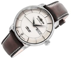 Srebrna koperta o klasycznej formie otacza biało kremowa tarcza, która przykuwa wzrok subtelną głębią koloru, idealnie komponując się z precyzyjnymi srebrnymi indeksami i srebrno czarnymi wskazówkami, zapewniając dobrą czytelność. Dynamiczny charakter podkreśla czarny sekundnik, a całość zamyka ciemno brązowy, skórzany pasek z kontrastującą białą nitką, który dodaje elegancji i klasy, idealnie współgrając ze srebrną sprzączką i koronką. To kwintesencja stylu i wyrafinowania, gdzie każdy detal został zaprojektowany z myślą o perfekcji.
