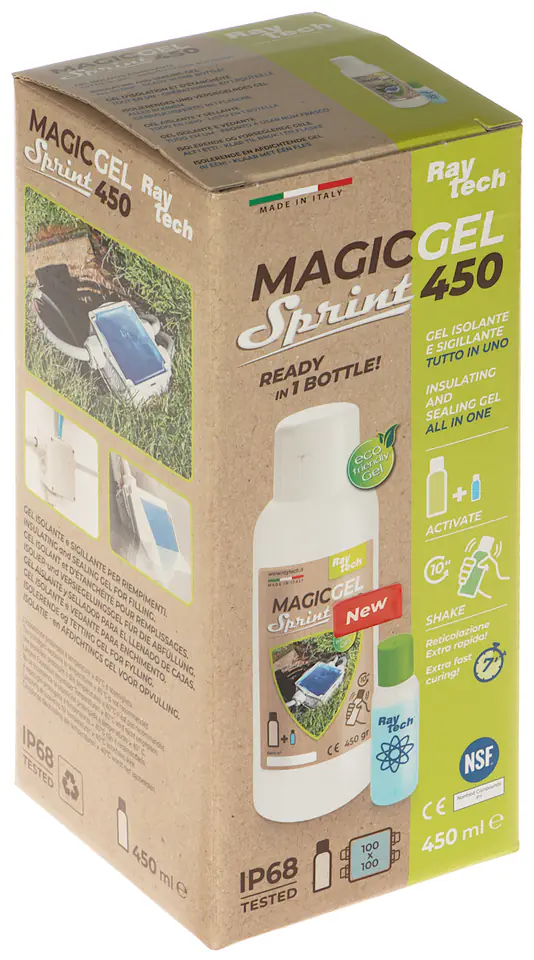 Dwuskładnikowy żel izolacyjny MAGIC-GEL-SPRINT-450 zapewnia wysoki poziom ochrony przed wnikaniem wody oraz zanieczyszczeń do puszek połączeniowych oraz muf kablowychPonadto dzięki konsystencji żelu, istnieje możliwość wyjęcia zawartości z zabezpieczonej preparatem puszki oraz ponownego użycia żelu po np. wymianie złącza, lub przewodów