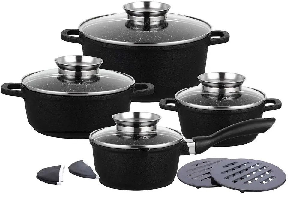 12 elementowy zestaw garnków z niezwykle trwałą powłoką granitową. Z zewnątrz pokryte powłoką o porowatej, spękanej strukturze Crack Design. Daje to ciekawy efekt wizualny. Wyposażony w pokrywki szklane z uchwytem Aroma Knob w którym umieszczono dozownik oleju, dzięki któremu podczas gotowania lub duszenia można podawać olej lub płynne przyprawy.