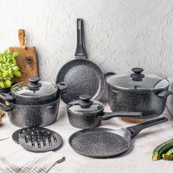 12 elementowy zestaw garnków z niezwykle trwałą powłoką marmurkową. Ekskluzywny design spotyka się z niezrównaną funkcjonalnością, czyniąc ten zestaw idealnym rozwiązaniem dla każdego nowoczesnego kucharza.