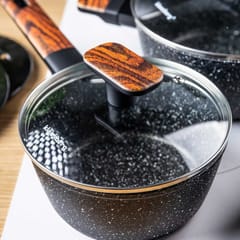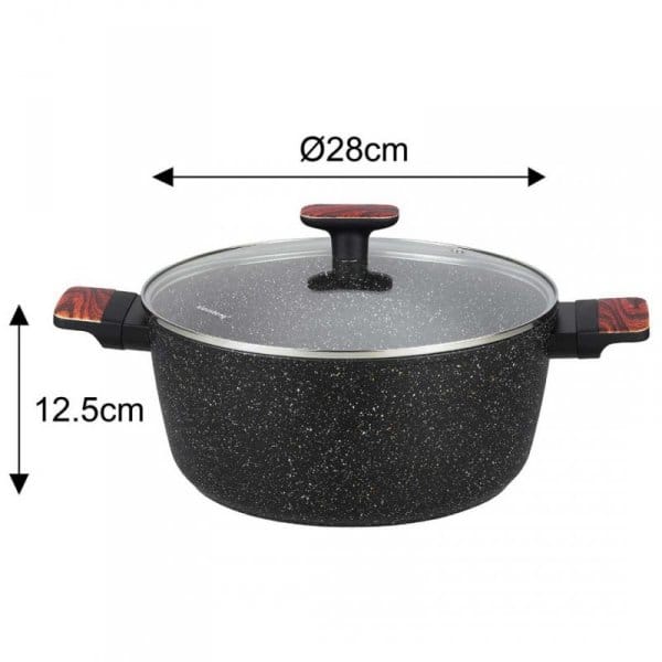 - Materiał i powłoka marmurkowa: Garnki wykonane są z odlewanego aluminium pokrytego powłoką marmurkową, która zapewnia doskonałe właściwości nieprzywierające. Powłoka jest odporna na zarysowania, dzięki czemu garnki są bardziej trwałe, a przy tym łatwe do czyszczenia. Naczynia można myć w zmywarkach na delikatnych programach ale dla zachowania nienagannego wyglądu przez długi czas zalecane jest mycie ręczne.