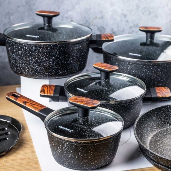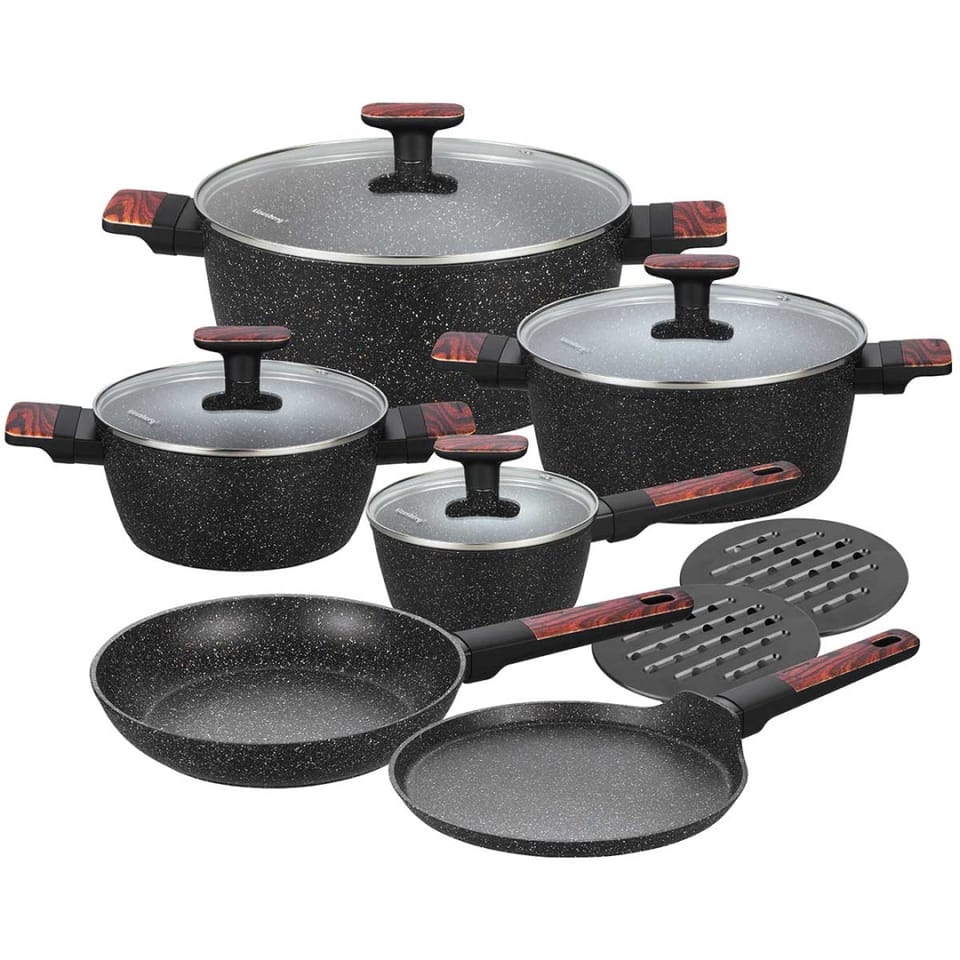 12-elementowy zestaw garnków marmurkowych w kolorze czarnym ze szklanymi pokrywami to kompletny i funkcjonalny zestaw kuchenny, idealny do przygotowywania różnorodnych dań. Dzięki eleganckiemu wyglądowi oraz solidnemu wykonaniu jest zarówno praktyczny, jak i stylowy. Poniżej szczegółowy opis elementów zestawu i ich właściwości.
