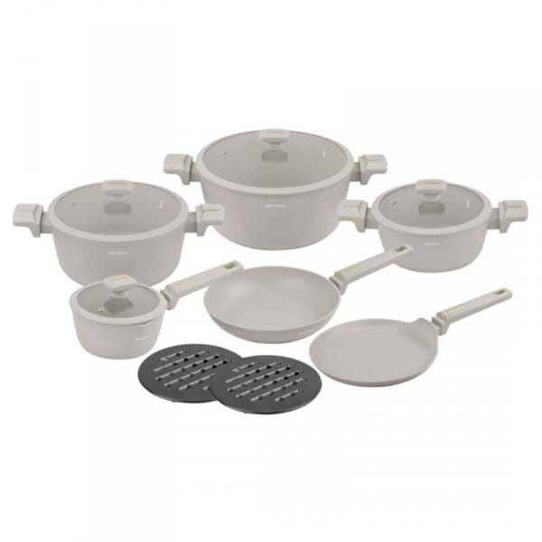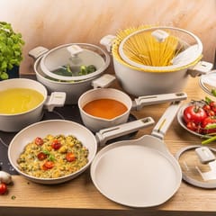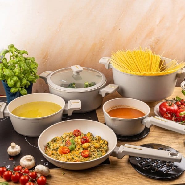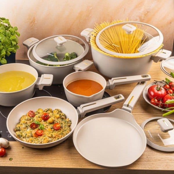 Zestaw zawiera 12 praktycznych elementów, w tym dwie patelnie i komplet pokrywek z hartowanego szkła z odpowietrznikiem pary, które pozwalają kontrolować proces gotowania bez podnoszenia pokrywki. Ergonomiczne uchwyty soft-touch gwarantują pewny, bezpieczny chwyt i wygodę użytkowania.