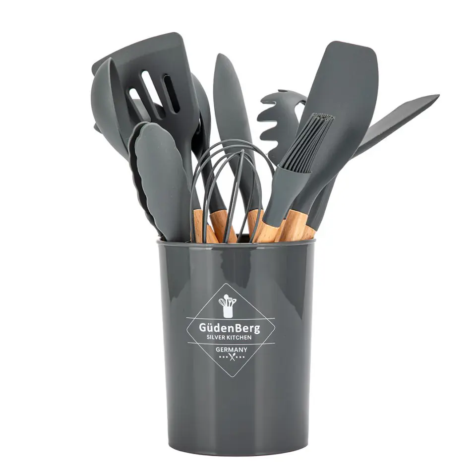 12 elementowy zestaw nylonowych przyborów kuchennych z rączkami z drewna bambusowego. Przybory polecane szczególnie do naczyń z powłokami ceramicznymi i teflonowymi. Materiał z którego są wykonane nie rysuje powierzchni naczyń. Jest odporny na wysoką temperaturę do 210 stopni C. Posiada szczególne właściwości antybakteryjne.