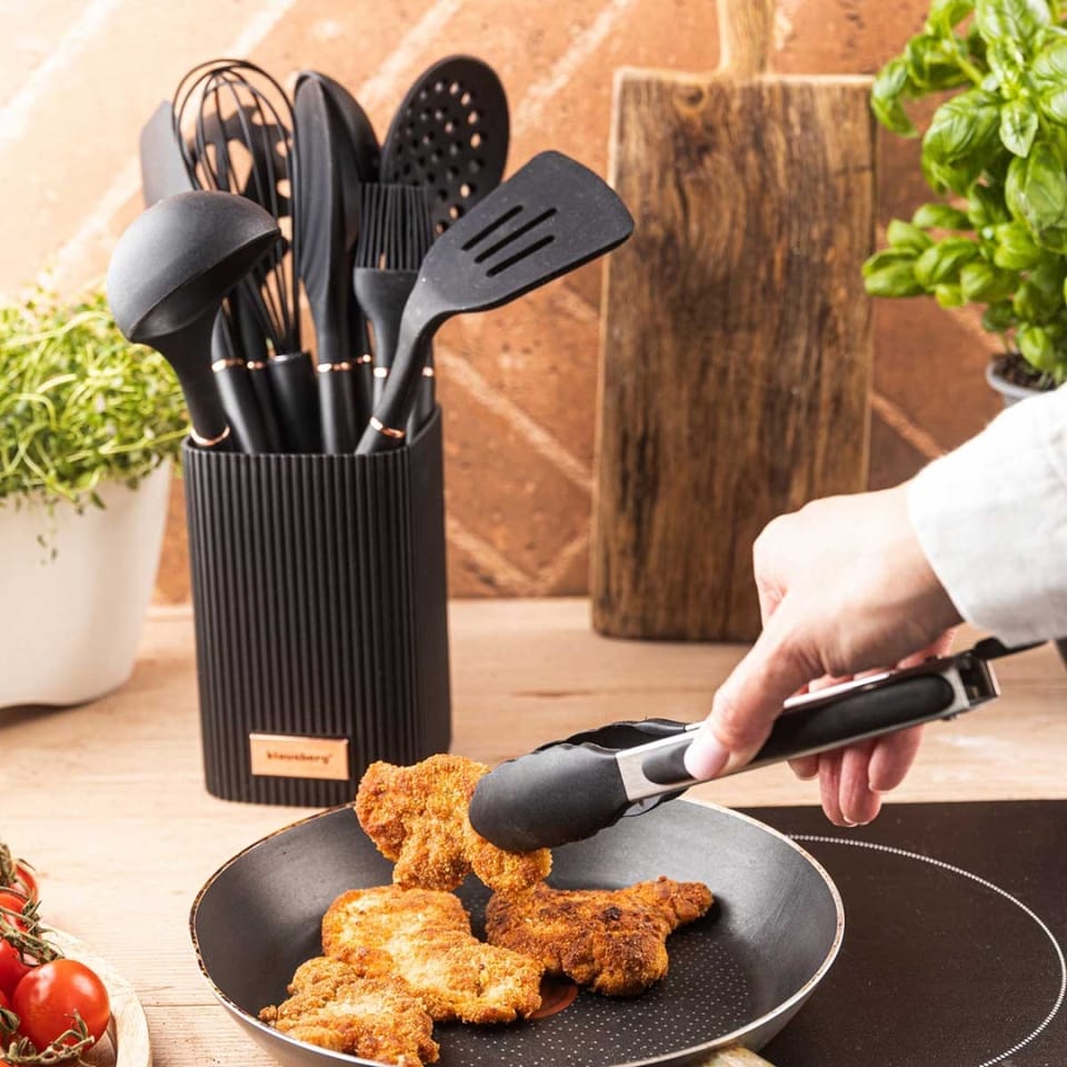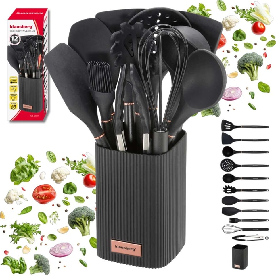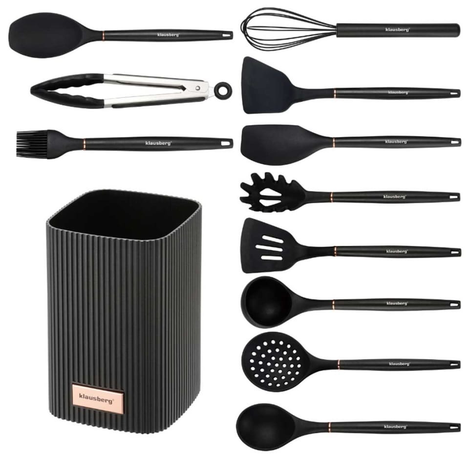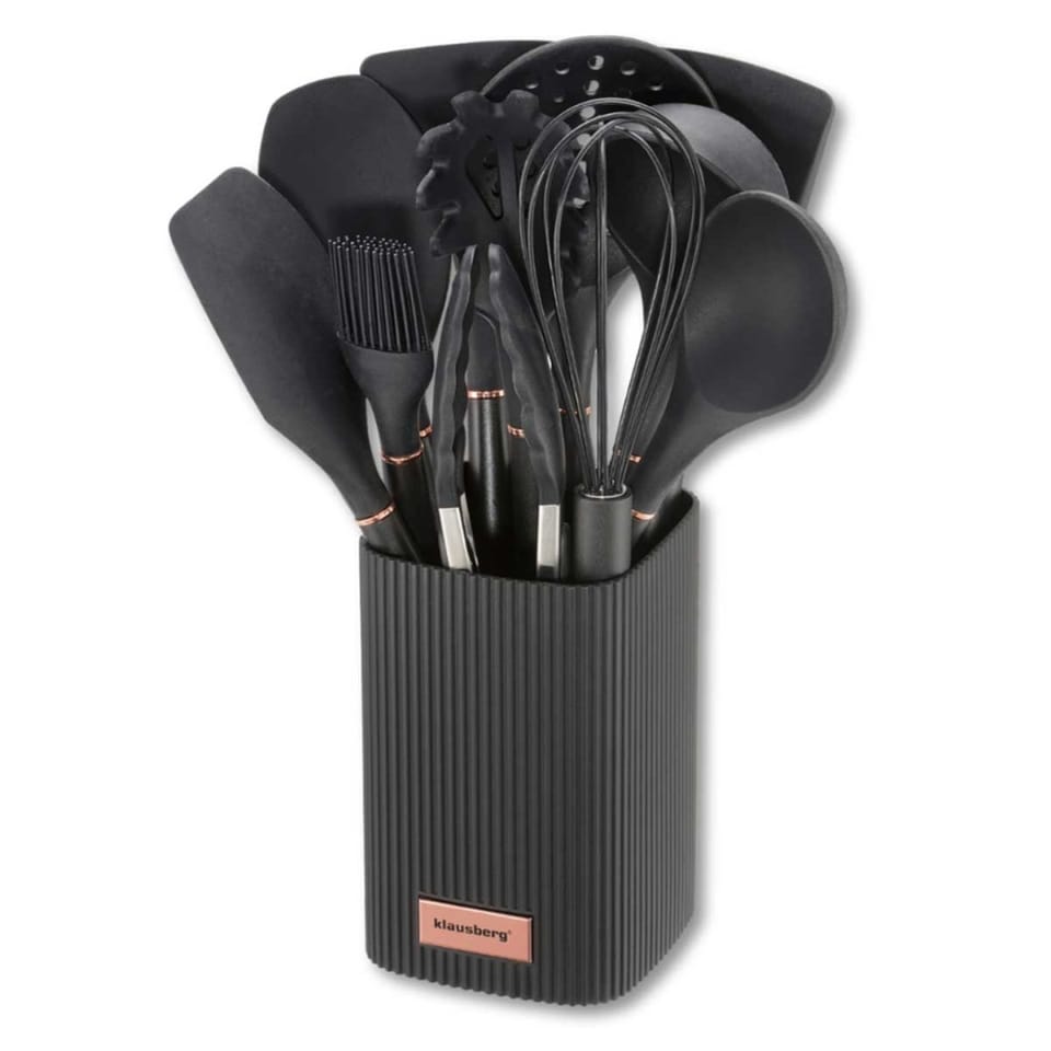 Klausberg KB-9011 to kompletny zestaw 12 przyborów kuchennych, zaprojektowany z myślą o codziennym gotowaniu w domu oraz intensywnym użytkowaniu w gastronomii. Połączenie silikonu spożywczego i stali nierdzewnej zapewnia trwałość, bezpieczeństwo dla naczyń oraz wygodę pracy. Całość uzupełnia praktyczny stojak, który pomaga utrzymać porządek na blacie kuchennym.
