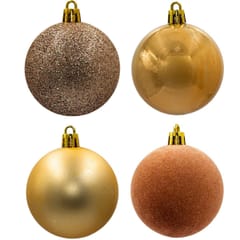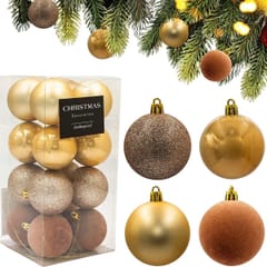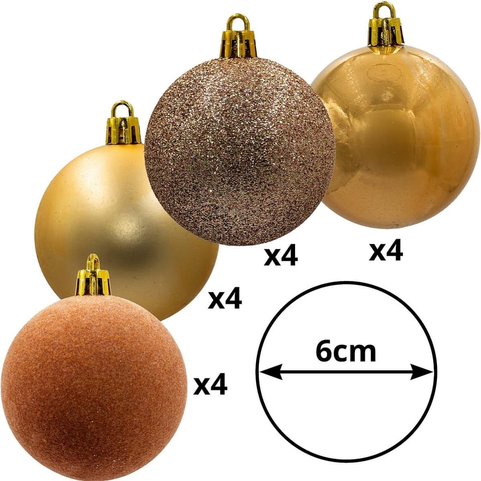 - W zestawie: bombka o średnicy 6cm o 4 fakturach matowe, perłowe, brokatowe i aksamitneMateriał: tworzywo sztuczneKolor: złotyWymiary opakowania (plastikowe pudeko): 11,8 x 11,8 x 23,6 cm (śr. x wys.)Marka: Christmas DecorationIlość w zestawie: 16 szt.