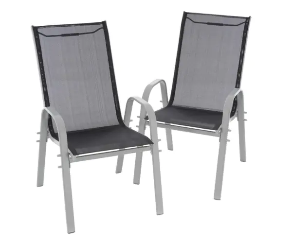 Zestaw 2 krzeseł ogrodowych kempingowe czarne stelaż szary Krzesło sztaplowane z wysokie oparcie wykonane z podwójnie malowanej proszkowo stalowej ramy idealnie nadaje się do użytku wewnątrz i na zewnątrz. Siedzisko i oparcie krzesła wykonane są z czarnego, elastycznego pokrycia Textilene. Krzesło ma podłokietniki po prawej i lewej stronie, co zapewnia relaksujące siedzenie. Kilka krzeseł można łatwo ustawiać jeden na drugim, aby zaoszczędzić miejsce, gdy nie są używane. Materiały użyte w tym krześle są bezobsługowe, odporne na warunki atmosferyczne i nie wymagają specjalnych środków pielęgnacyjnych.SPECYFIKACJA TECHNICZNA Materiał: Textilene 2x1 (pokrycie) + stal (rama) Kolor stelaża: jasnoszary Kolor okładki: czarny Wymiary całkowite (po złożeniu): SxGxW 55 x 72 x 97 cm Wymiary siedziska: ok. 42 x 45 cm Wymiary oparcia: ok. 58 x 45 cm Wysokość siedziska: ok. 43 cm Szerokość podłokietnika: ok. 4 cm max. obciążenie ok. 110 kg