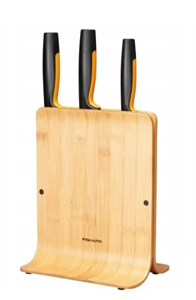 Zestaw 3 noży w bambusowym bloku Fiskars® Functional Form™ zawiera: nóż szefa kuchni duży, nóż Santoku i nóż do obierania