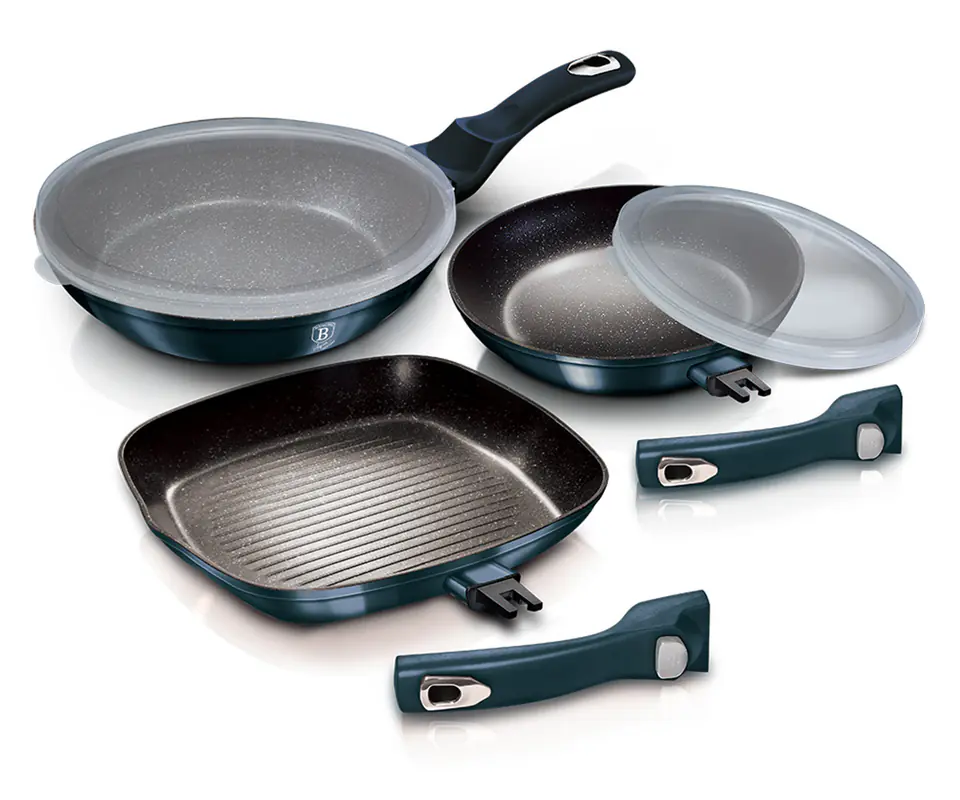 Naczynia z serii AQUAMARINE EDITION firmy BERLINGER HAUS wykonane są z wysokiej klasy odlewanego aluminium pokrytego wewnątrz potrójną powłoką granitową (marble) o bardzo wysokim współczynniku twardości. Powłoka zewnętrzna w kolorze metalicznym grafitowym. Te atrakcyjne i modne naczynia wyposażone są standardowo w uchwyty typu SOFT TOUCH (silikon handle). Przystosowane do wszystkich rodzajów kuchenek: gazowa, elektryczna, ceramiczna, halogenowa, indukcyjna. System TURBO INDUCTION (bardzo szybko nagrzewają się) pozwala zaoszczędzić nawet 35% energii.