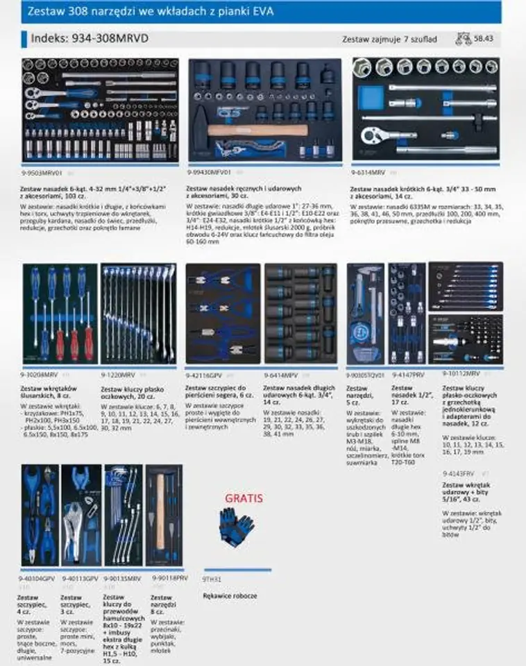 'Zestaw 308 narzędzi w 15 modułach 937-308MRVD King Tony (wkłady piankowe, zajmuje 7 szuflad standardowego wózka King Tony). Zawartość: Moduł 1: nasadki długie 6-kątne 1/4" w rozmiarach 4, 4.5, 5, 5.5, 6, 7, 8, 9, 10, 11, 12, 13 mm, nasadki krótkie 6-kątne 1/4" w rozmiarach 4, 4.5, 5, 5.5, 6, 7, 8, 9, 10, 11, 12, 13 mm, nasadki z bitem TORX 3/8" o długości 50 mm: T10, T15, T20, T25, T27, T30, T40, T45, T50, nasadki z bitem HEX 3/8" o długości 50 mm: H3, H4, H5, H6, H8, H10, H12, nasadki długie 6-kątne 3/8" w rozmiarach 10, 12, 13, 14, 15, 16, 17, 18, 19, 21 mm, nasadki krótkie 6-kątne 3/8" w rozmiarach 8, 10, 11, 12, 13, 14, 15, 16, 17, 18, 19, 20, 21, 22 mm, nasadki do świec 6-kątne 3/8" w rozmiarach 16, 21 mm, nasadka do świec 12-kątna 3/8" 14 mm, nasadki krótkie 6-kątne 1/2" w rozmiarach 10, 12, 13, 14, 15, 16, 17, 18, 19, 20, 21, 22, 23, 24, 27, 28, 30, 32 mm, grzechotka 1/4" z przyciskiem zwalniającym 24 zęby, grzechotka 1/4" z przyciskiem zwalniającym 32 zęby, grzechotka 1/4" z przyciskiem zwalniającym 32 zęby, przedłużki 1/4" 54, 100 mm, 3/8" 75, 250 mm, 1/2" 125, 250 mm, przegub kardana 1/4", 3/8", 1/2", pokrętło łamane 1/2", adapter 1/4" na 3/8", redukcje 3/8" na 1/4" oraz 1/2" na 3/8", uchwyt trzpieniowy do wkrętarek 1/4" na nasadki 1/4" oraz 3/8", długość 50 mm. (9-9503MRV01) Moduł 2: nasadki 3/4" krótkie 6-kątne w rozmiarach 33, 34, 35, 36, 38, 41, 46, 50 mm, przedłużki 3/4" o długości 110, 200, 400 mm, grzechotka 3/4" 24 żeby (6779-20F), pokrętło przesuwne 3/4" o długości 500 mm, redukcja 3/4" na 1/2". (9-6314MRV) Moduł 3: nasadki gwiazdkowe E 3/8" krótkie w rozmiarach: E4, E5, E6, E7, E8, E11, nasadki gwiazdkowe E 1/2" krótkie w rozmiarach: E10, E12, E14, E16, E18, E20, E22, nasadki udarowe gwiazdkowe E 3/4" w rozmiarach: E24, E26, E28, E30, E32, nasadki z bitem HEX (imbus) 1/2" w rozmiarach: H14, H17, H19, nasadki udarowe długie 1" 6-kątne w rozmiarach: 27, 30, 32, 33, 36, redukcja udarowa 1" na 3/4", adapter udarowy z 1/2" na 3/4", młotek 2000 g, klucz do filtrów oleju o60~160 mm (320560), próbnik obwodu 6~24V. (9-99430MFV01) Moduł 4: klucze płasko-oczkowe 6-19, 21, 22, 24, 27, 30, 32 mm. (9-1220MRV) Moduł 5: wkrętaki płaskie do pobijania w rozmiarach: 5.5 x100, 6.5 x 100, 6.5 x 150, 8 x 150, 8 x 175, wkrętaki krzyżakowe (PH) do pobijania w rozmiarach: PH1 x 75, PH2 x100, PH3 x 150. (9-30208MRV) Moduł 6: szczypce do pierścieni Segera wewnętrznych: proste o długości 180 mm oraz 250 mm i wygięte o długości 170 mm, a także szczypce do pierścieni zewnętrznych: proste o długości 180 mm oraz 250 mm i wygięte o długości 170 mm. (9-42116GPV) Moduł 7: młotek 395 g, punktak fi 4 mm, przecinak 17 mm, 20 mm, wybijak igłowy fi 3, 4, 5, 6mm. (9-90118PRV) Moduł 8: szczypce uniwersalne wąskie dł. 200 mm, szczypce uniwersalne 163 mm, szczypce tnące boczne dł. 188 mm, szczypce uniwersalne długie wąskie dł. 280 mm. (9-40104GPV) Moduł 9: szczypce nastawne, szczypce uniwersalne wąskie mini, szczypce Morse''''a dł. 225 mm zakrzywione szczęki z obcinaczem do drutu, szerokość szczęk 10 mm i dł. 30 mm. (9-40113GPV) Moduł 10: nasadki 1/2” z bitami HEX 3-8, 10, 12, 14, 17, 19 mm dł. 60 mm, SPLINE M5, M6, M8, M10, M12, M14 dł. 60 mm, SPLINE z otworem M16, M18 dł. 66 mm. (9-4147PRV) Moduł 11: nasadki długie udarowe 6-kątne 3/4" w rozmiarach 9, 21, 22, 24, 26, 27, 29, 30, 32, 33, 35, 36, 38, 41 mm. (9-6414MPV) Moduł 12: klucze płasko-oczkowe z grzechotką jednokierunkową 72 zęby w rozmiarach 10, 11, 12, 13, 14, 15, 16, 17, 19 mm oraz trzy adaptery do nasadek umożliwiające wykorzystanie kluczy 10, 13 i 19 mm odpowiednio jako grzechotki 1/4", 3/8" i 1/2". (9-10112MRV) Moduł 13: wkrętak udarowy 4112 King Tony wraz z dwoma adapterami na bity (10 mm i 5/16") oraz 40 bitami: bity 10 mm HEX (imbus) w rozmiarach H5, H6, H7, H8, H10, H12 o długości 36 mm, bity 10 mm TORX w rozmiarach T30, T40, T45, T50, T55, T60 o długości 36 mm, bity 10 mm SPLINE w rozmiarach M6, M8, M10, M12 o długości 36 mm, bity 5/16" HEX (imbus) w rozmiarach H3, H4, H5, H6, H7, H8, H10, H12 o długości 32 mm, bity 5/16" TORX w rozmiarach T15, T20, T25, T27, T30, T40, T45, T50 o długości 32 mm, bity 5/16" PHILIPS (krzyżak) w rozmiarach PH2, PH3 o długości 36 mm, bity 5/16" płaskie w rozmiarach 9x1,6 i 11x2 o długości 36 mm, bity 5/16" PHILIPS (krzyżak) w rozmiarach PH2, PH3 o długości 80 mm, bity 5/16" płaskie w rozmiarach 8 x 1,2 i 10 x 1,6 o długości 80 mm. (9-4143FRV) Moduł 14: suwmiarka cyfrowa 200 mm, szczelinomierz 0.04, 0.05, 0.06, 0.07, 0.08, 0.09, 0.10, 0.15, 0.20, 0.25, 0.30, 0.35, 0.40, 0.45, 0.50, 0.55, 0.60, 0.65, 0.70, 0.75, 0.80, 0.85, 0.90, 0.95, 1.00 mm, miara zwijana 5 metrów, II klasa dokładności, nóż łamany 18 mm z 4 zapasowymi ostrzami, wykrętaki do uszkodzony śrub/szpilek (9-90305TQV01) Moduł 15: zestaw kluczy do przewodów hamulcowych 8x10, 10x12, 11x13, 12x14, 17x19, 19x22, komplet imbusów HEX L długich H1.5, H2, H2.5,H3, H4, H5, H6, H8, H10 (9-90135MRV).''"'