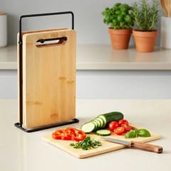 Zestaw czterech bambusowych desek na stojaku. Deski sprawdzą się zarówno do krojenia jak i serwowania śniadań czy przystawek. Każda deska posiada wygodny uchwyt.