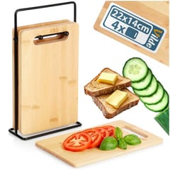 - Zestaw 4 szt. desek do krojenia na stojaku - Praktyczny komplet składający się z czterech desek do krojenia oraz stojaka, przeznaczony do codziennego przygotowywania i serwowania posiłków. Każda deska ma wymiary 22 x 14 cm i grubość 0,7 cm. Wymiar zewnętrzny stojaka z deskami to 15 x 7 x 27 cm.